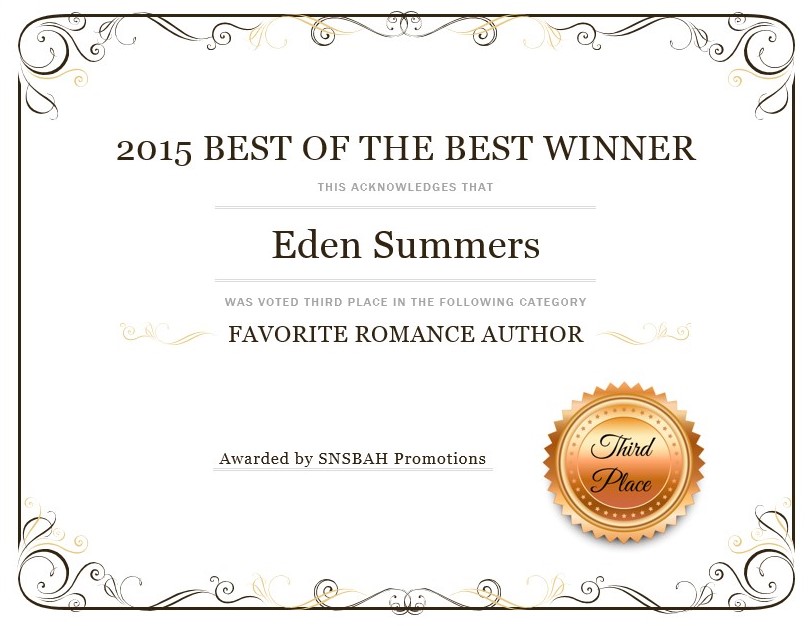 In late 2010, Eden’s romance obsession could no longer be sated by reading alone, so she decided to give voice to the sexy men and sassy women in her mind.
